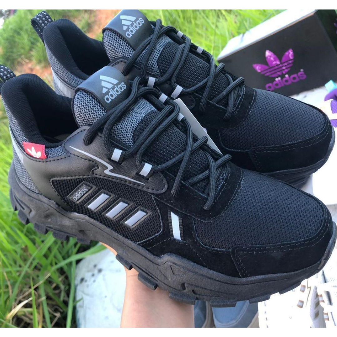 Visual robusto com solado tratorado, ideal para a rotina e passeios. Cabedal em mesh com reforços sintéticos/camurça, respirável e durável. Detalhes refletivos e logo Adidas dão o acabamento moderno.